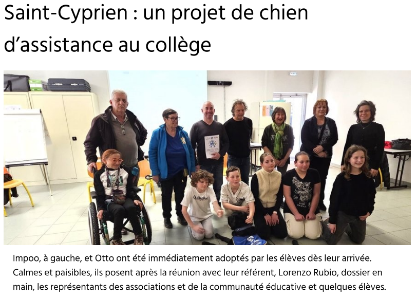 La Catalane Handi’chiens pour l’éducation du chien et la formation du référent qui s’en occupera, L’association Les bouchons d’amour catalans qui récoltera les fonds nécessaires avec la vente des bouchons et le club de football des Phœnix catalans, dont Lorenzo Rubio est le président, partenaire de la Catalane Handi’chiens et du collège. Prochaine étape : trouver un ou plusieurs référents parmi le personnel du collège.